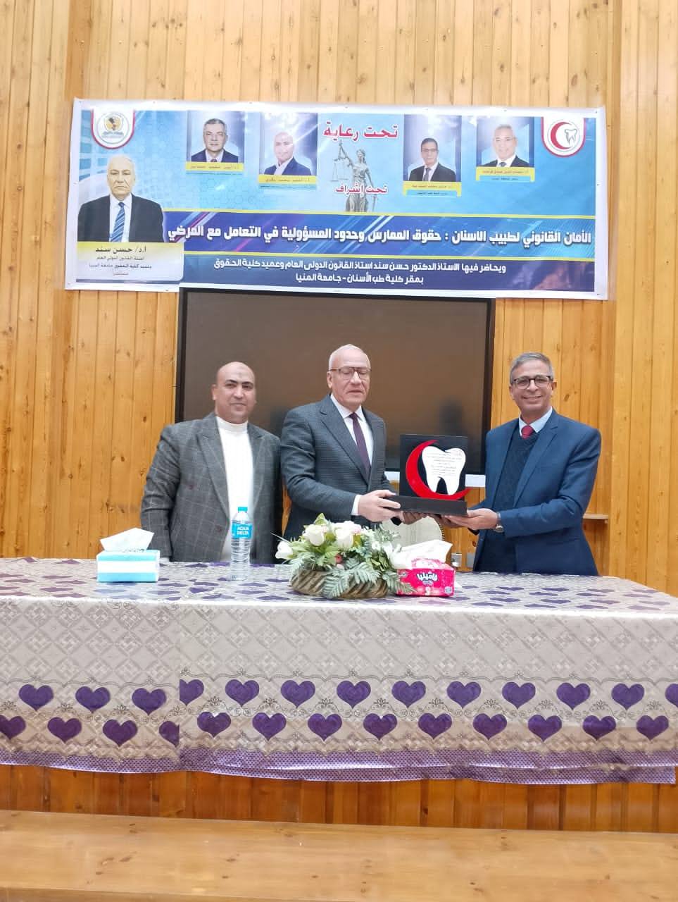 وحاضر في الندوة الأستاذ الدكتور حسن سند، أستاذ القانون الدولي العام وعميد كلية الحقوق – جامعة المنيا، حيث استعرض خلال محاضرته الأبعاد القانونية المرتبطة بممارسة مهنة طب الأسنان، موضحًا حقوق الممارس وحدود المسئولية القانونية، وآليات التعامل القانوني السليم مع المرضى، بما يضمن حماية الطبيب والارتقاء بجودة الخدمات الطبية المقدمة.